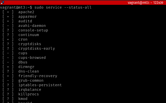 Detecta la presencia de GRUB2 (Gestor de arranque) y si este está protegido con contraseña para evitar que alguien lo modifique ajeno al administrador principal del sistema. Luego comprueba con systemctl los servicios que están habilitados y corriendo, pero en este sistema este comando no funciona, para este sistema habría que hacer uso de service (anterior a systemd):